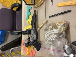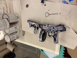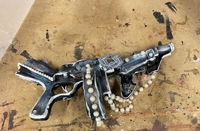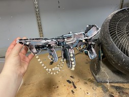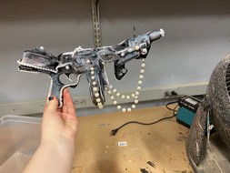 This show’s scenic design was inspired by the work of Jean-Michel Basquiat. For this prop in particular, the idea was multiple guns haveing been morphed togther to create this gun, which was also dripping with pearls, and painted in the style of the rest of the props and the virtual backgrounds.